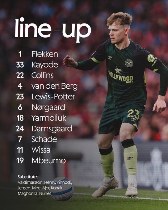 원정팀 브렌트포드는 4-3-3 포메이션으로 맞섰다. 마르크 플레켄이 골키퍼 장갑을 꼈고, 마이클 카요데, 나단 콜린스, 세프 판 덴 베르흐, 키어런 루이스-포터가 포백에 포진했다. 중원은 크리스티안 노르가르, 예고르 야르몰류크, 미켈 담스고르가 구성했으며, 전방 스리톱에는 케빈 샤데, 요안 비사, 브리안 음베우모가 나서 공격을 주도했다.