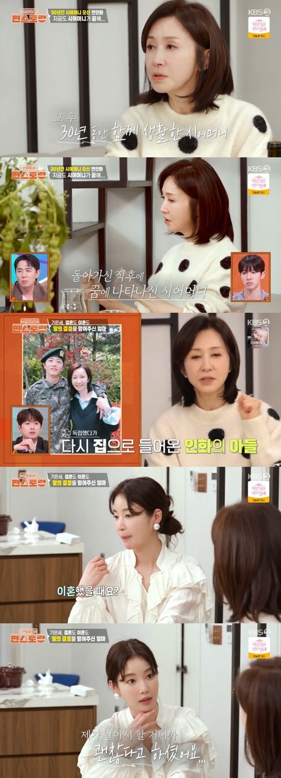 벌써 결혼 생활 37년 차라는 전인화. 25살 대학 졸업 후 바로 결혼했다는 전인화는 30년 동안 시어머니와 함께 살았다고 밝혔다.