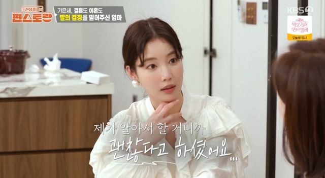 이에 전인화는 "이혼했을 때 어머니는 어떠셨냐"고 기은세에 조심스레 물었고, 기은세는 "제가 알아서 할 거니까 괜찮다고 하셨다. 결혼할 때도 그랬고 헤어질 때도 그랬고 엄마가 저한테 뭘 반대해본 적이 없다"고 털어놨다.
