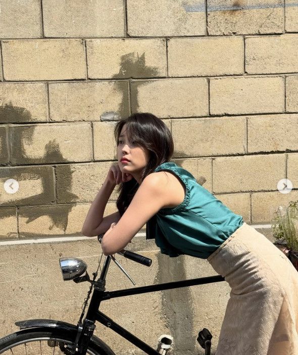 사진 속 아이유는 청량한 푸른색 실크 민소매 블라우스에 하늘거리는 스커트를 매치해 화사한 봄 분위기를 물씬 풍겼다. 디지털카메라를 든 채 포즈를 취하거나, 자전거에 살짝 기대어 햇살을 만끽하는 듯한 그의 모습은 보는 이들마저 기분 좋게 만든다.