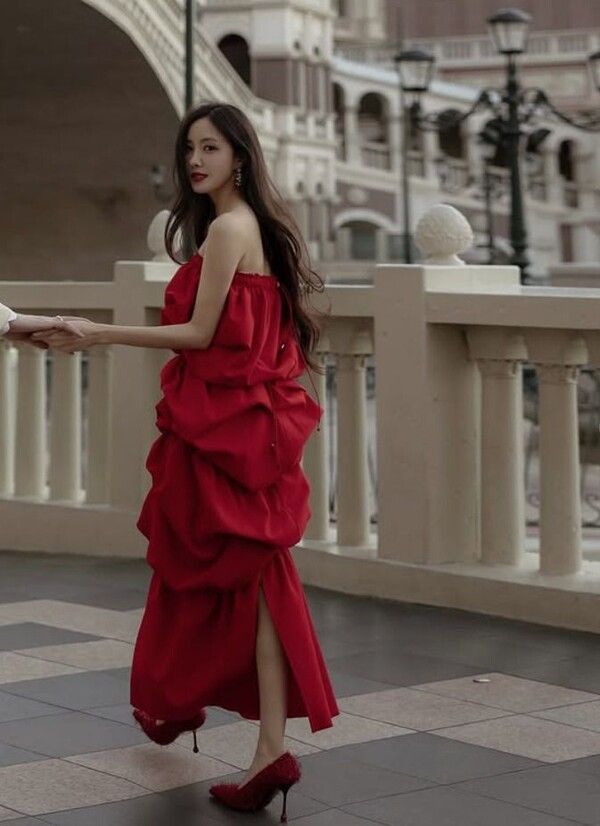 공개된 사진 속 효민은 강렬한 붉은색 드레스를 입고 이국적인 풍경을 배경 삼아 다채로운 포즈를 취하고 있다. 특히 남편에게 꽃다발을 건네받은 순간 포착된 효민의 얼굴에는 행복한 미소가 가득해 보는 이들까지 훈훈하게 만들었다.