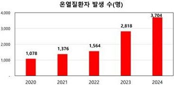 질병관리청(청장 지영미) 온열질환 응급실감시체계 자료에 따르면 2020년 1,078명에서 2024년 3,704명으로 3배 이상 증가했다.