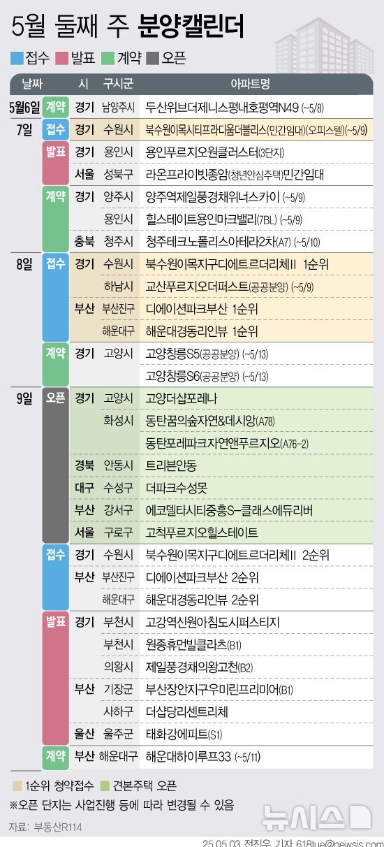뉴시스 보도에 따르면, 청약 접수는 경기 하남시 천현동 '교산푸르지오더퍼스트'(공공분양), 경기 수원시 이목동 '북수원이목지구디에트르더리체Ⅱ', 부산 해운대구 중동 '해운대경동리인뷰' 등에서 진행된다.