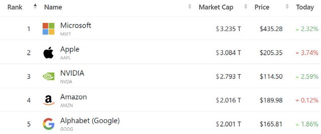 시가총액 3위는 엔비디아, 4위는 아마존, 5위는 알파벳으로 기존과 순위가 같았다. 간밤 엔비디아는 2.59%, 알파벳은 1.86% 상승했다. 반면 아마존은 창업자인 제프 베이조스가 앞으로 1년간 아마존 주식을 47억 5000만달러(6조 6000억원) 어치를 매도하겠다고 밝히자 주가가 0.12% 하락하며 약보합을 보였다.