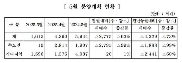 이는 전월(4390가구) 대비 2775가구(63%) 감소한 물량으로 전년 동월(5944가구)과 비교하면 4329가구(73%)나 줄어든 것이다.