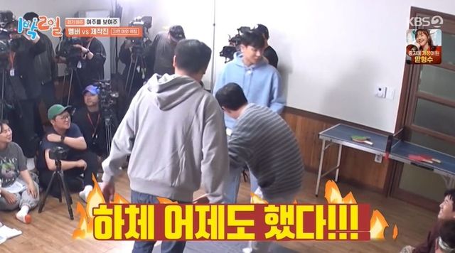 이어 제작진 선수 야외 취침을 건 대결이 시작됐다. 1번 주자는 주종혁 피디로, 딘딘이 출격했다. 상대 전적은 2:0으로, 주 피디는 딘딘에게 전패한 상황. 딘딘은 거만한 포즈로 “형이 하고 싶은 거 하자”라고 했고, 주 피디는 “저 자세가 진짜 짜증 나지?”라면서 참참참 게임으로 복수를 하기로 했다. 패배한 사람은 탁구채로 곤장 맞기. 또 패배한 주 피디는 딘딘에게 엉덩이를 내밀었고, 딘딘은 탁구채로 초강력 스매싱을 날렸다.