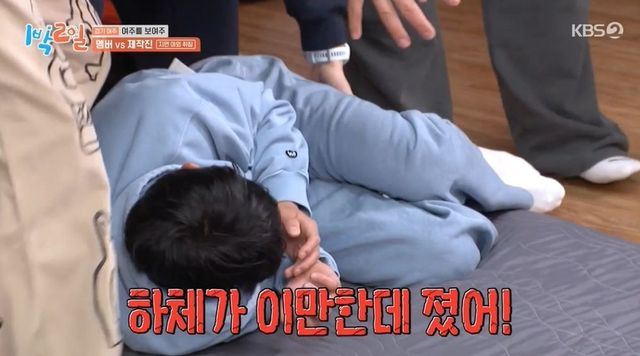 2번 주자는 유재현 피디. 앞서 다리씨름에서 많은 멤버들을 이겼던 상대였다. 유 피디는 당시 패배했던 이준에게 “요즘 하체 운동 좀 하세요?”라고 도발했다. 이준은 “기분이 나빠서 하겠다. 하체 어제도 했다”라고 외치며 도발에 응수했다. 이준은 “나 여기서 지면 패션 근육으로 할게”라고 선언까지 한 상황. 하지만 이준이 선언이 무색하게 이준이 패배했고, 멤버들에게 이불말이를 당했다.