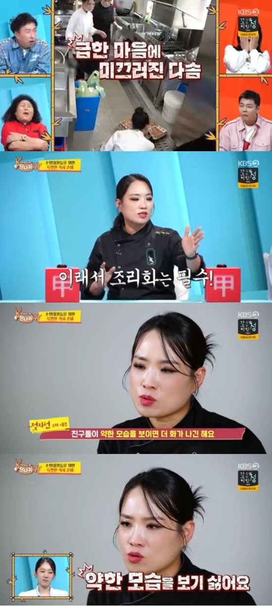 정지선은 "직원들은 윗 사람한테 감정을 드러내면 안 된다. 감정을 본인이 컨트롤해야 한다. 거기서 못 버티면 주방 일 못한다. 약한 모습 보이면 더 화가 난다. 약한 모습 보기가 싫다"고 냉정하게 얘기할 수밖에 없었던 속마음을 전했다.