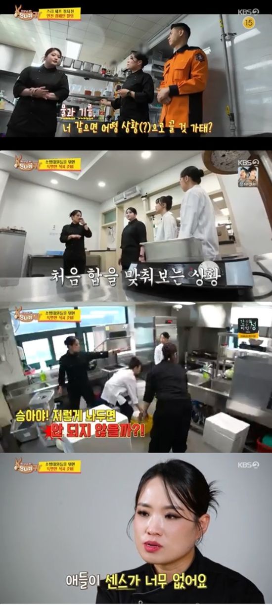 정지선은 "애들이 센스가 없다. 요리하는 애가 밥솥도 못 열고 마음을 내려놓기는 했다. 내가 다 해야하는구나"라고 말했다.