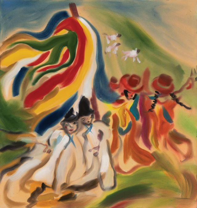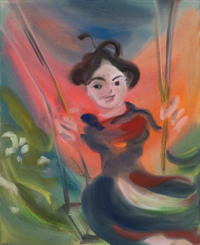 전시 제목은 «축제»이며 직접적으로 한국의 축제인 ‘단오’에 주목합니다. 요즘 시대에 점차 잊혀지고 있는 세시풍속을 작품의 주요 테마로 선택한 지점이 흥미로웠습니다. 저는 집단 무의식에 깊은 관심을 갖고 있습니다. 의례, 사람들이 모이는 모습, 마치 핵융합 속 입자들처럼 함께 춤추는 사람들의 축적된 에너지, 그리고 전통과 기도의 힘에 매료되어왔습니다. 그래서 누군가 ‘단오’에 대해 이야기했을 때 즉시 그 주제를 탐구하고 싶었습니다. 단오에 무당들이 입는 화려한 의상과 말총으로 만든 검은 모자가 특히 마음에 듭니다. 또한 여성들이 ‘머리를 풀어헤치고’ 자유를 즐기는 모습은 제 머릿속에 많은 이미지를 불러왔습니다. 런던 월리스 컬렉션에 포함되어 있는 프라고나르의 그네 작품을 늘 좋아해왔는데요. 그네는 정말 멋진 모티프입니다. 자유로우면서도 얽매인 움직임, 무중력 상태이면서도 지지해주는 구조, 그 모든 것에 다양한 은유가 담겨 있다고 생각합니다. 제가 늘 사용하는 DIY 페인트 브러시 이름도 ‘Swingcolor’네요. 농담은 이만하고, 줄타기 역시 대담함과 균형을 담은 중요한 모티프입니다. 그림을 그리는 것 또한 대담함과 균형을 찾는 과정이니까요.