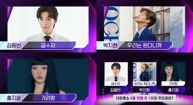 이번 주 1위 후보로는 박지현의 ‘우리는 된다니까’, 김용빈의 ‘금수저’, 홍지윤의 ‘가리랑’이 나란히 올랐다. 박지현은 지난달 28일 1위를 차지한 데 이어 이번에도 정상에 오를 경우 2주 연속 1위라는 기록과 함께 ‘명예의 전당’ 재입성이라는 영예를 노린다.