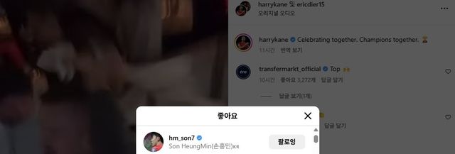 반면 케인만큼이나 무관의 설움이 짙은 손흥민이 이날 케인의 우승 자축 영상 게시물에 '좋아요'를 누른 것도 화제였다.