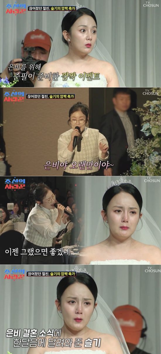 상상도 못한 박슬기의 등장에 강은비의 눈물은 멈출 줄 몰랐다. 박슬기는 두 사람을 위한 축가를 열창했다. 그리고는 "은비를 못 보겠다. 너무 울어서"라며 반가운 마음을 내비쳤다.