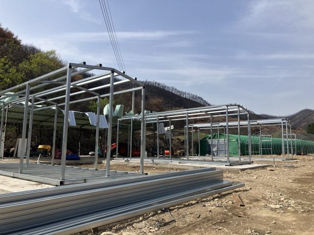 지난달 24일, 사촌 1리엔 제일 먼저 박 이장의 밭에 8평짜리 임시주택이 들어서고 있었다. 콘크리트로 닦인 기반 위에 은색 철골 구조가 설치돼 있었다. 사촌1리 전소된 12채 중 집터가 여의치 않은 다섯 가구의 임시 거처였다 .