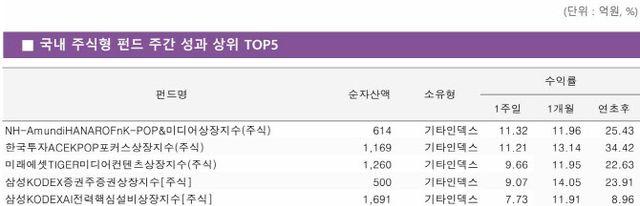 6일(4월25~5월 2일) 수익률을 분석한 결과 한 주간 가장 높은 수익률을 기록한 펀드는 NH아문디자산운용의 ‘HANARO Fn K-POP & 미디어’ ETF로 한 주간 11.32% 상승했다. 2위는 수익률 11.21%를 기록한 ‘ACE KPOP 포커스’ETF다. 3위는 ‘TIGER 미디어컨텐츠’ ETF로 한 주간 9.66% 상승했다. 미디어·엔터 관련 ETF가 수익률 3위까지 모두 차지한 셈이다.