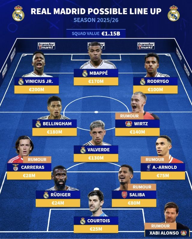 축구 이적 전문 사이트 트랜스퍼마르크트는 6일(한국시간) 2025~26시즌 레알이 꾸릴 수 있는 베스트11을 소개했다.