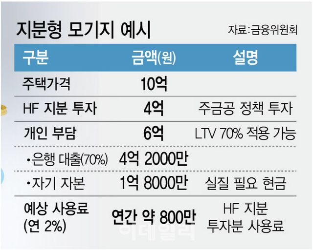 예컨대 10억원짜리 아파트를 산다고 하면 개인이 6억원을 조달하고 HF가 나머지 4억원을 투자하는 방식이다. 이 중 개인 부담액의 상당수도 주택담보인정비율(LTV) 70%를 적용해 은행 대출로 충당할 수 있다. 이론상 1억 8000만원만 있으면 10억원짜리 아파트에 들어갈 수 있다.
