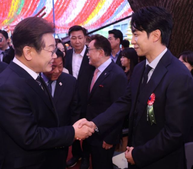 조계사 행사에서 악수하는 이재명 후보와 이승기 / 연합뉴스
