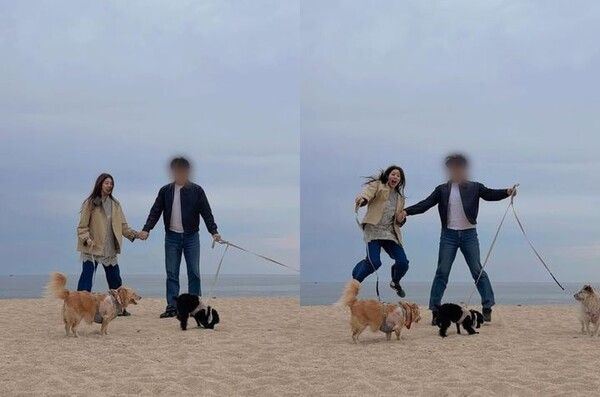 "참, 까만 푸들 노아는 유기견이었는데 단기 임보로 저희 집에 왔다가 눌러앉게 된 강아지다. 오늘 첫 바다 구경을 했는데 엄청 행복해했다"고 덧붙이며 여러 장의 사진을 올렸다.