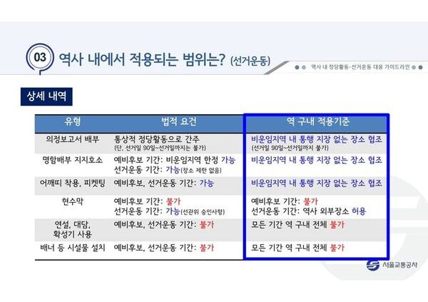 이에 서울교통공사는 선거관리위원회 질의와 법률 전문가 자문을 거쳐 지난 2월 '역사 내 정당 활동·선거 운동 대응 가이드라인'을 제작해 영업 분야 전 직원에 알렸다.