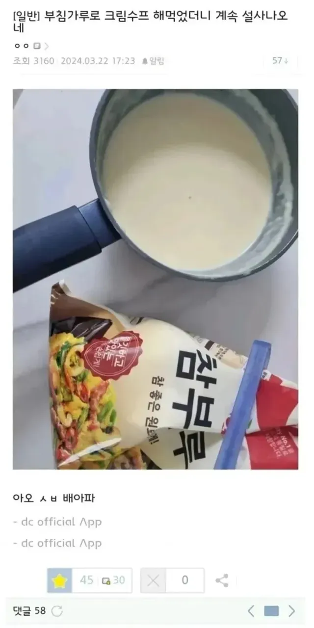 부침가루로 크림수프 해먹었더니 배탈났네.jpg,,