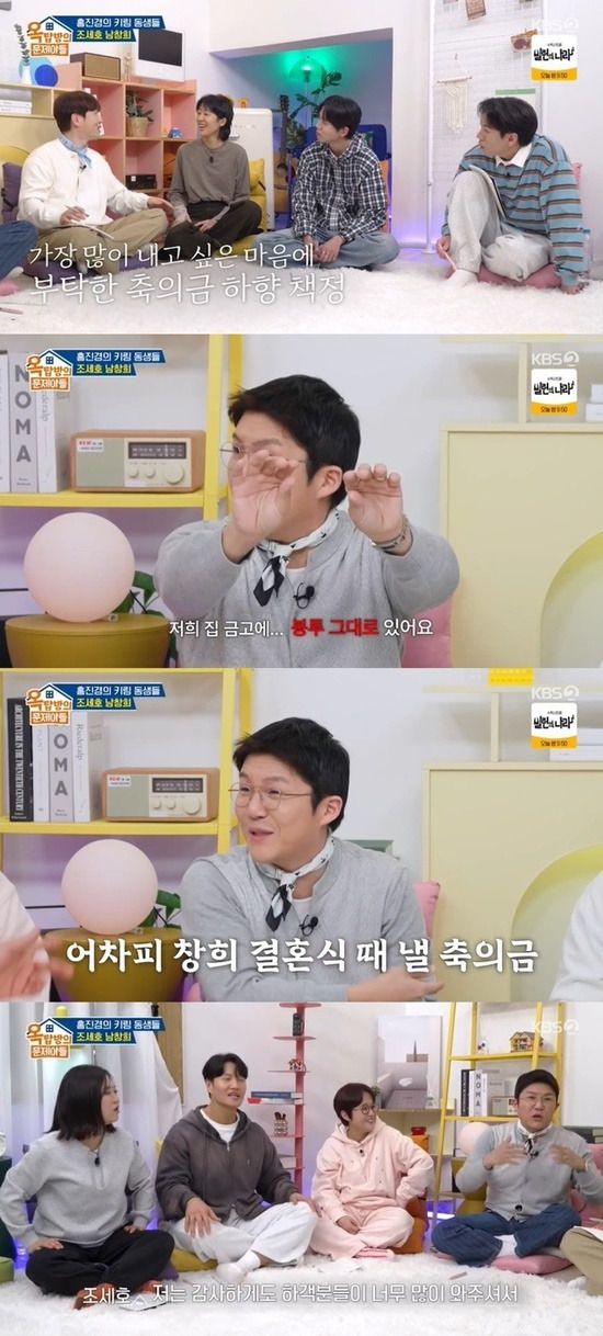 조세호는 지난 달 방송된 KBS 2TV 예능 '옥탑방의 문제아들'의 게스트로 출연해 축의금 에피소드를 꺼내며 절친인 남창희가 준 축의금을 집 금고에 봉투 그대로 넣어뒀다고 밝혔다.