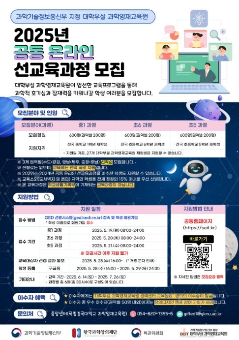 [경기연합신문 ] 과학기술정보통신부와 한국과학창의재단은 오는 5월 19일부터 21일까지 전국 초‧중등 학생 대상 ‘2025년 대학부설 과학영재교육원 공동 온라인 선교육과정’ 수강생을 모집한다고 밝혔다.