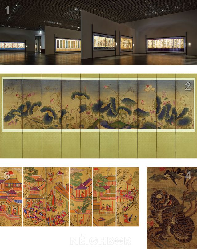 1 <조선민화전> 전시 전경. 2 ‘수련도10폭병풍’, 19세기, 비단에 채색, 개인 소장. 3 ‘구운몽도6폭병풍’, 20세기 전반, 종이에 채색, 호림박물관. 4 ‘호작도’, 19세기, 종이에 채색, 개인 소장.