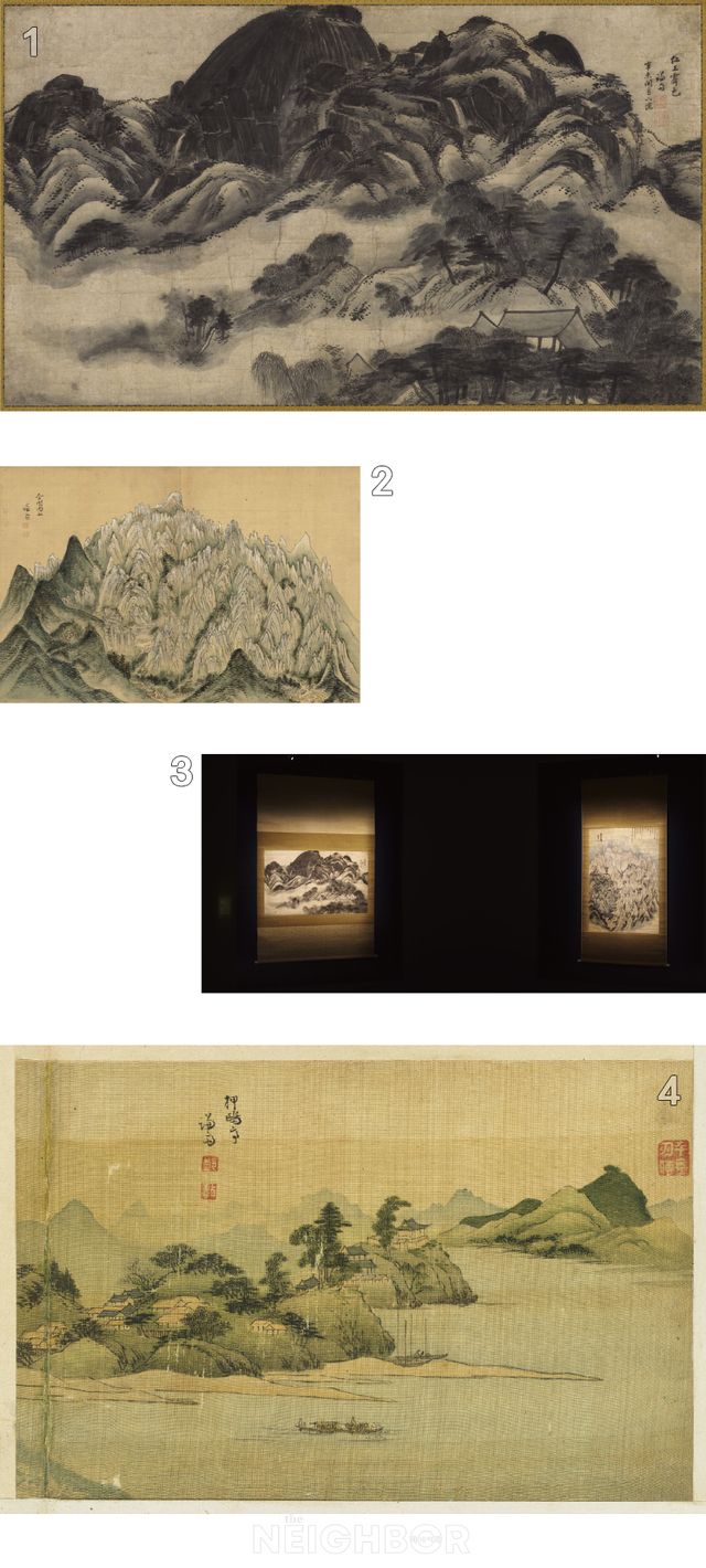 1 정선, ‘인왕제색도’, 조선, 1751년, 종이에 수묵, 79.2×138.2cm. 국립중앙박물관, 이건희 회장 기증. 국보. 2 정선, ‘금강내산(해악전신첩)’, 조선, 1747년, 비단에 수묵담채, 32.6×49.6cm. 간송미술문화재단, 보물. 3 <겸재 정선> 전시 인트로 전경. 4 정선, ‘압구정(경교명승첩)’, 조선, 1740~1741년, 비단에 채색, 20.0×31.0cm. 간송미술문화재단, 보물.