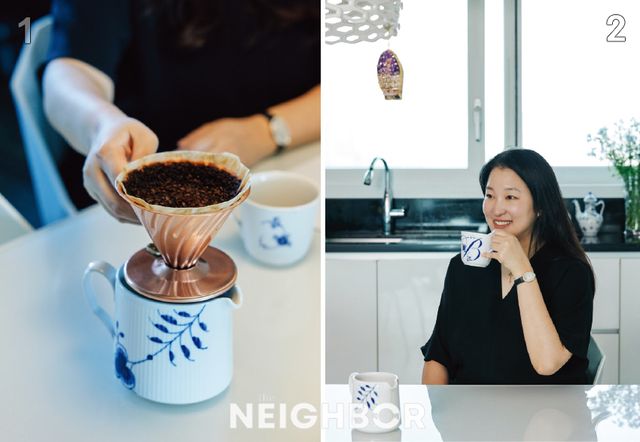 1 매일 아침 커피를 내리는 블루 메가 모던 저그와 황동 드리퍼. 2 자신의 이니셜인 B가 새겨진 머그를 든 정보연 작가.