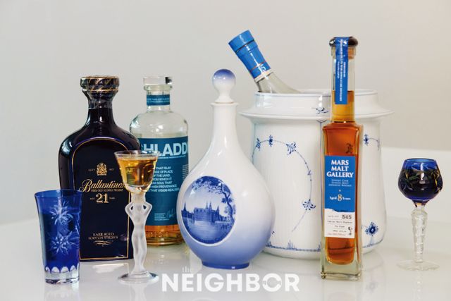 로얄코펜하겐과 어울리는 블루 위스키 보틀을 모았다. 왼쪽부터 발렌타인 21년 올드 보틀, 브룩라디 18년, 글렌모렌지 캐드볼 에스테이트, 마르스 몰트 갤러리 8년.
