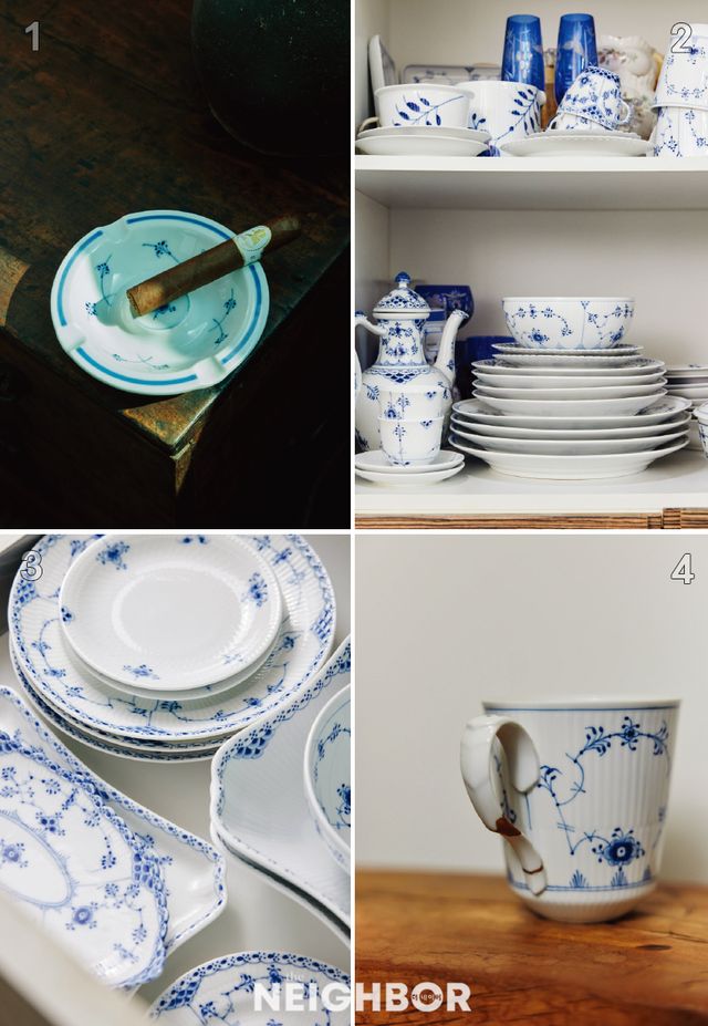 1 빙앤그뢴달의 빈티지 애쉬트레이와 시가. 2 차곡차곡 정리해둔 다양한 형태의 플레이트. 3 데일리로 활용하는 블루 라인 식기. 4 손잡이가 깨진 커피잔을 킨츠키로 수선해 사용한다.