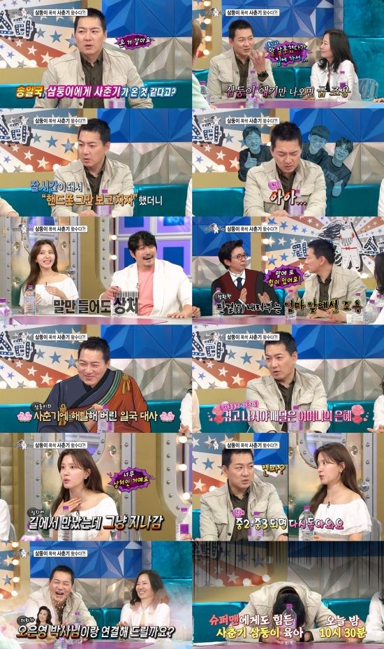 이어 송일국이 ‘사춘기 삼둥이’의 모습을 재연해 눈길을 사로잡는다. 잘 시간이 되어 핸드폰을 그만하라고 한 자신에게 강렬한 눈빛을 보내는 삼둥이의 모습부터 자신의 뽀뽀를 피하는 모습 등을 보여주며 한숨을 쉬자, 김구라는 “하지 마, 뽀뽀! 아내한테 해요!”라고 외쳐 폭소를 자아낸다.