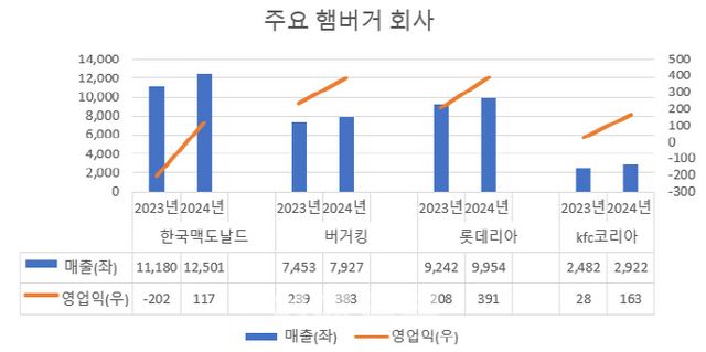 7일 금융감독원 전자공시시스템에 따르면 지난해 한국맥도날드, 비케이알(버거킹 운영), 롯데GRS(롯데리아 운영), KFC코리아 4곳의 합계 매출액은 3조 2866억원으로 전년 대비 7% 증가했다. 같은기간 영업이익도 1056억원으로 286% 불어났다.