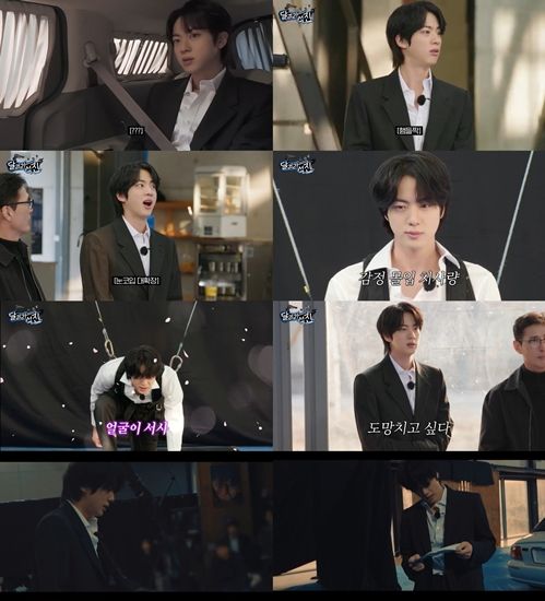 이날 검정 수트 차림으로 등장한 진은 의문의 사람들에게 습격을 받고 어딘가로 끌려가며 영화 같은 서막을 열었다. 팽팽한 긴장감이 감도는 분위기 속 그가 도착한 곳은 액션 스쿨. 진은 스턴트 배우들의 시범에 놀라움을 감추지 못했고 본격적인 연습 전부터 겁에 질린 모습으로 웃음을 자아냈다.