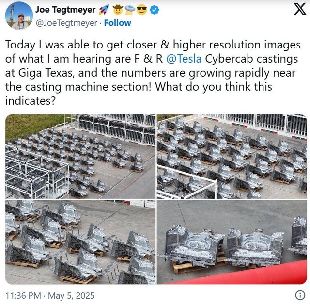 그는 “이 부품들은 사이버캡의 전면(F)과 후면(R) 주조물로 보인다”며 “공장 내 캐스팅 구역 주변에서 그 수가 빠르게 늘어나고 있다”고 설명했다.