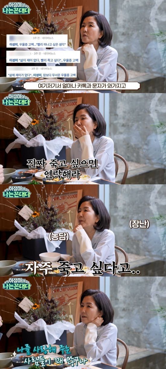 영상에서 이성미는 "내가 얼마 전에 방송에서 죽고 싶다고 했더니 여기저기서 문자가 왔다"고 운을 뗐다.