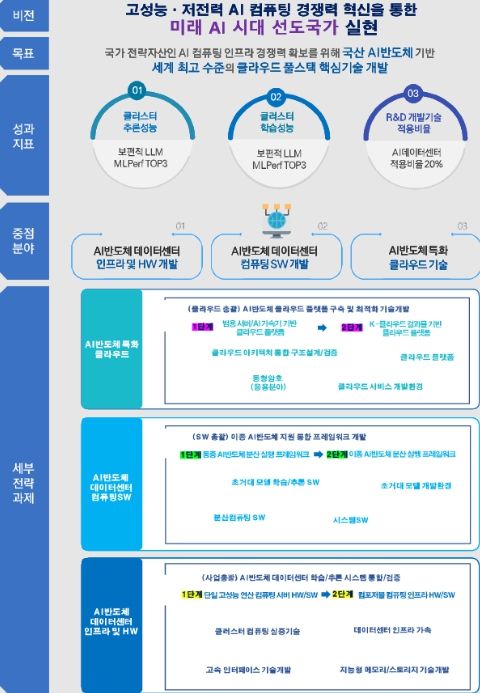 과기정통부는 국산 인공지능 반도체 기반 인공지능 컴퓨팅 기반시설의 성능효율을 2030년 세계 3위(글로벌 TOP3) 수준으로 강화하는 것을 목표로, 동 사업을 통해 우수한 성능을 갖춘 국산 인공지능 반도체를 기반으로 1만장 수준의 초거대 규모(하이퍼스케일급) 데이터센터를 구축·운영할 수 있는 기술을 확보할 수 있을 것으로 기대하고 있다.