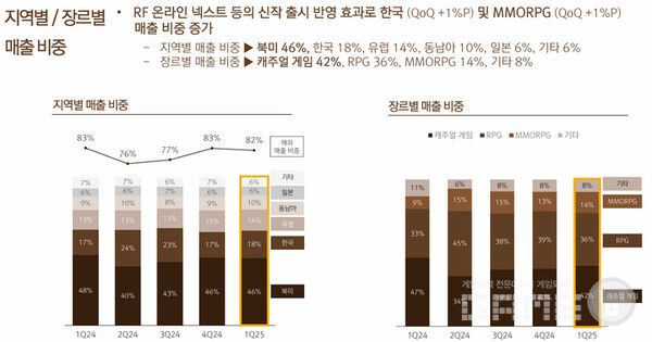 1분기 국가별 매출 비중은 북미 46%, 한국 18%, 유럽 14%, 동남아 10%, 일본 6%, 기타 6% 순으로 집계됐다. 장르별 매출 비중은 캐주얼 게임 42%, RPG 36%, MMORPG 14%, 기타 8%로 ‘RF 온라인 넥스트’의 출시 효과가 소폭 반영되어 국가별로는 한국이, 장르에서는 MMORPG가 전 분기 대비 성장했다.