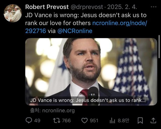 마지막으로 리트윗한 글이 트럼프 이민정책 비판하는 내용, 밴스를 ‘wrong’이라고 직접적으로 비판하는 글을 올려 화제 중