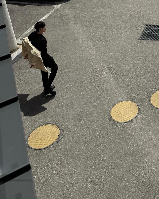 사진 속에는 올블랙에 연한 노란 빛깔의 재킷을 걸친 김윤재가 풍경을 감상하고 거리를 거닐고 있는 모습들이 담겨 있다. 봄 분위기가 물씬 풍기는 화사한 분위기와 옅은 미소가 시선을 사로잡는다.