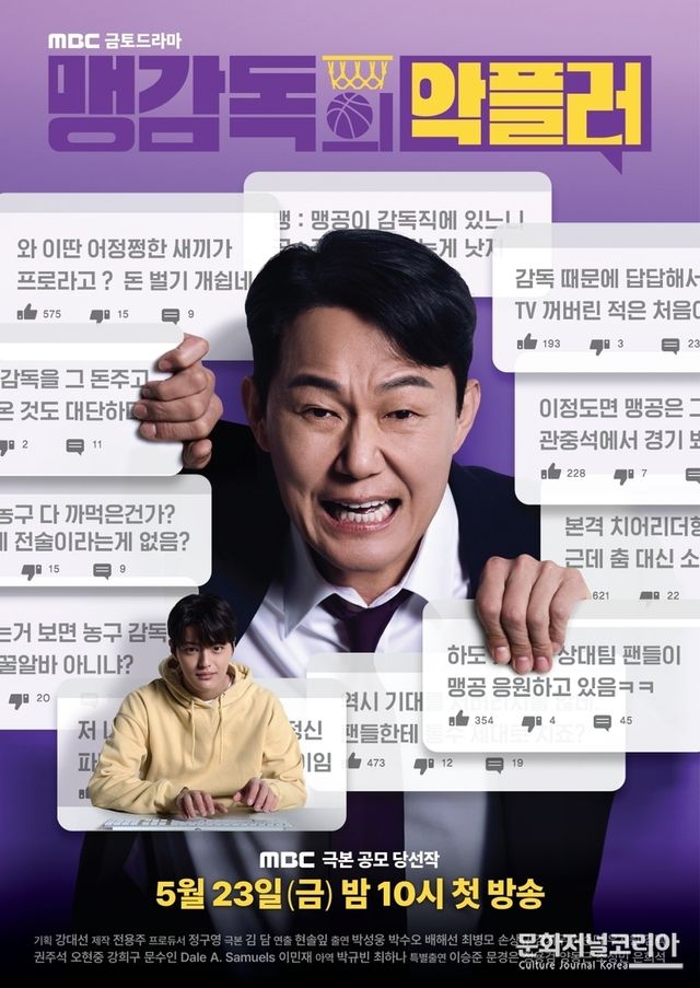 오는 5월 23일(금) 밤 10시 첫 방송을 앞두고 있는 MBC 2부작 금토드라마 ‘맹감독의 악플러’가 메인 포스터를 공개했다. MBC 드라마 ‘맹감독의 악플러’(기획 강대선/연출 현솔잎/극본 김담/제작 아이윌미디어/2부작)는 성적 부진으로 퇴출 위기에 놓인 프로농구 감독 맹공이 팀 성적을 위해 자신의 악플러 화진과 손잡으며 벌어지는 투 맨 게임 코미디를 그린 작품.