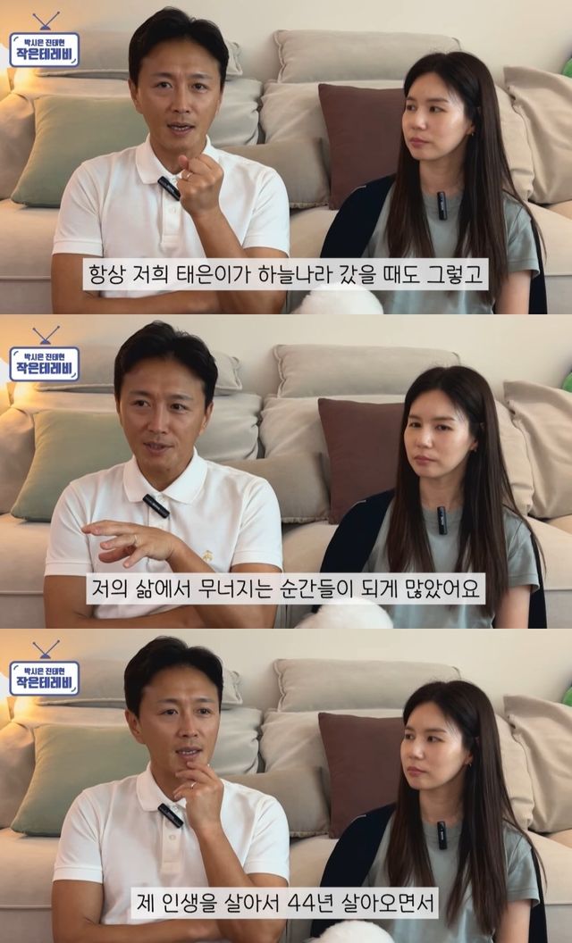 공개된 영상에서 진태현은 "저희 태은이가 하늘나라 갔을 때도 그렇고, 44년 인생을 살아오면서 무너지는 순간이 되게 많았다. 근데 무너져봤자 아무 소용이 없다"며 과거 유산의 아픔을 언급헀다.