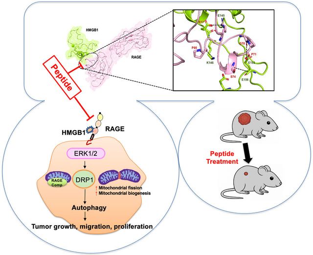 (좌측 하단) 이 결합을 차단하는 새로운 펩타이드는 RAGE 매개 ERK1/2 및 DRP1 신호전달 경로를 억제해 미토콘드리아 분열과 자가포식을 차단하고, 결과적으로 암세포의 증식·이동·생존을 억제했다.