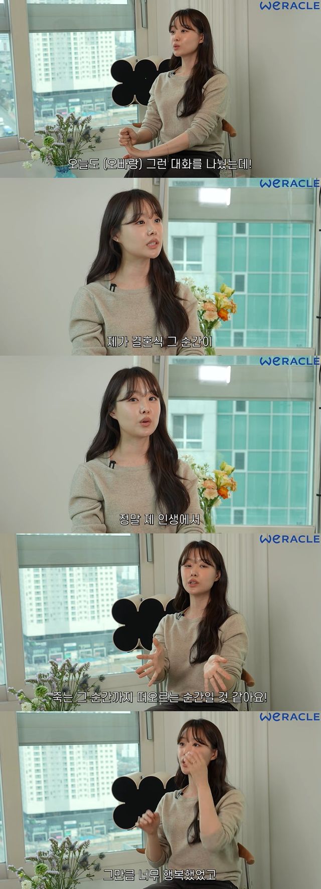 인생에서 가장 행복했던 순간에 대해 그는 "오늘도 (오빠랑) 그런 대화를 나눴다. 제가 결혼식 순간이 제 인생에서 죽는 그 순간까지 떠오르는 순간이었다. 그만큼 너무 행복했었다"며 박위와의 결혼식을 꼽았다.