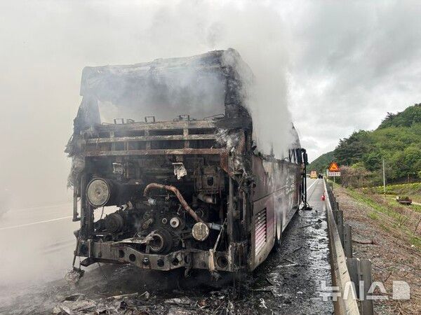 9일 오후 6시11분께 충북 단양군 적성면의 중앙고속도로 부산방향 단양휴게소 인근에서 A(55)씨가 몰던 고속버스에 불이 났다.