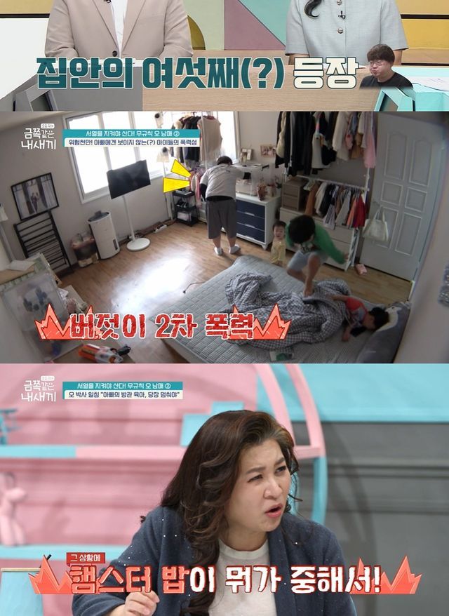 남편이 햄스터 밥을 챙기는 사이에서도 한 방에서 둘째는 넷째를 때렸고, 이에 남편은 "진짜 처음 봤다. 장난은 몇 번 봤는데 저렇게 심각하게 때리는 건 처음 봤다"고 답했다.