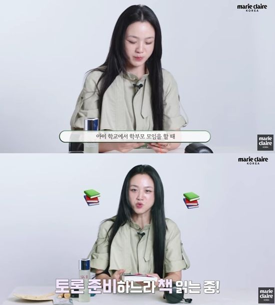 탕웨이는 "이건 제 숙제다. 아이 학교에서 학부모 모임을 할 때 같이 토론할 내용이 이 책에 있어서 토론 준비하느라 책을 읽고 있다"고 소개했다.
