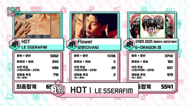 10일 방송된 MBC 가요프로그램 ‘쇼! 음악중심’에서는 르세라핌의 ‘핫’(HOT), 오반의 ‘플라워’(Flower), 지드래곤 외의 ‘굿데이 2025’가 1위를 놓고 경쟁했다.