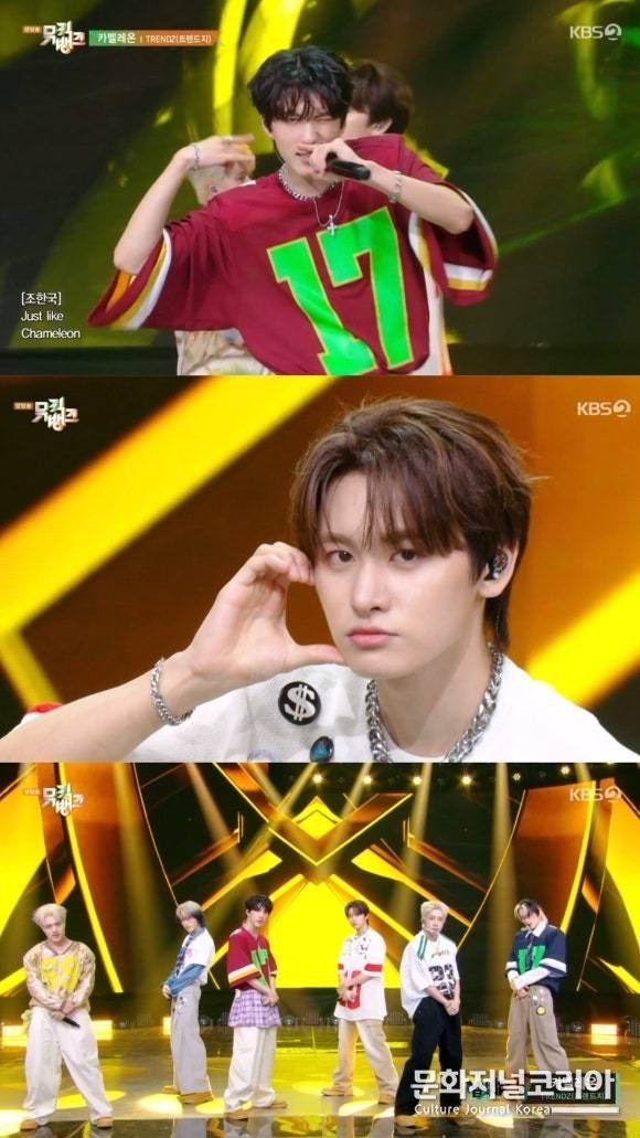 트렌드지(하빛, 리온, 윤우, 조한국, 라엘, 은일, 정예찬)는 9일 방송된 KBS ‘뮤직뱅크’에 출연, ‘카멜레온’의 중독적인 멜로디로 시청자들을 사로잡았다. 이날 다섯 번째 싱글 앨범 ‘Chameleon(카멜레온)’의 타이틀곡 ‘카멜레온’으로 2주차 활동의 포문을 연 트렌드지는 물오른 매너와 깊어진 매력으로 글로벌 퍼포먼스돌의 매력으로 무대를 장악했다.